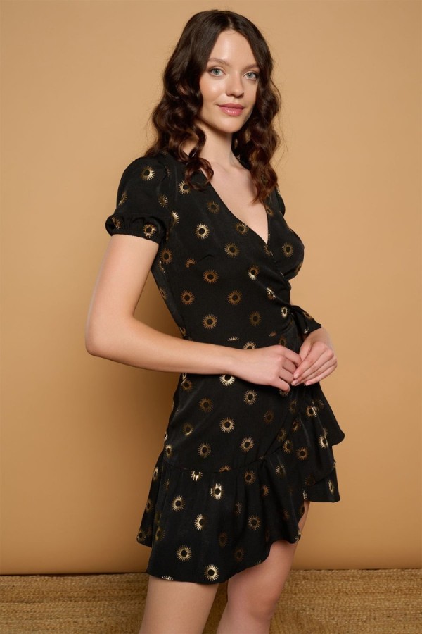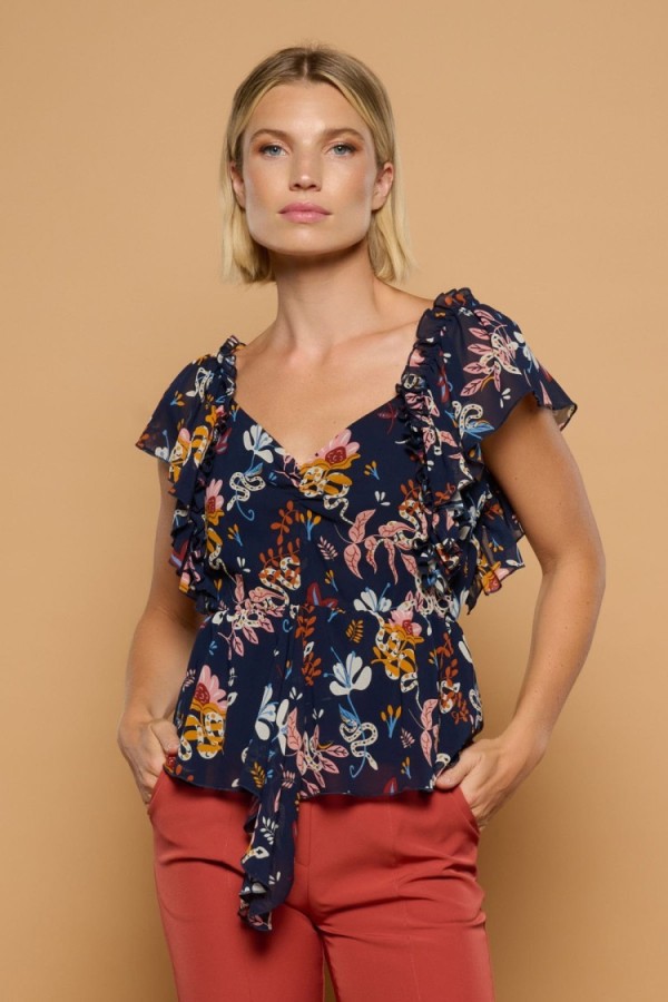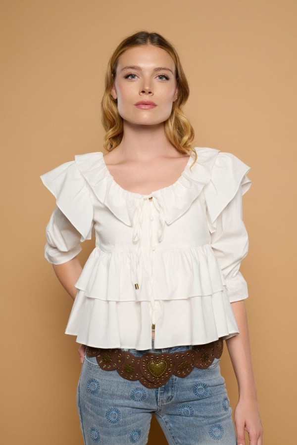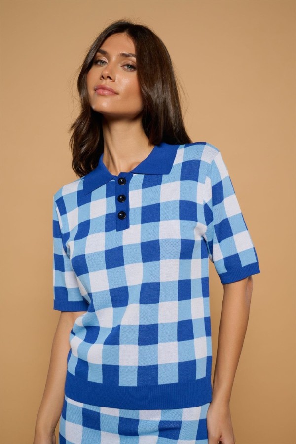 Camisa de cuello solapa con escote en pico y manga corta. Cierre frontal con botones a tono y detalle de bolsillo de parche en el pecho.