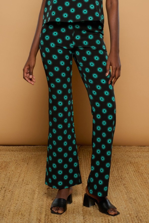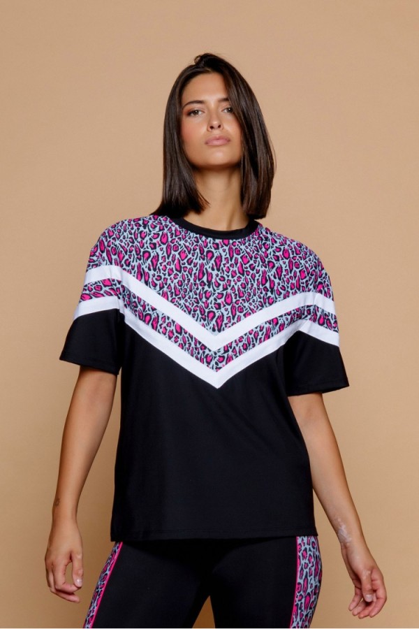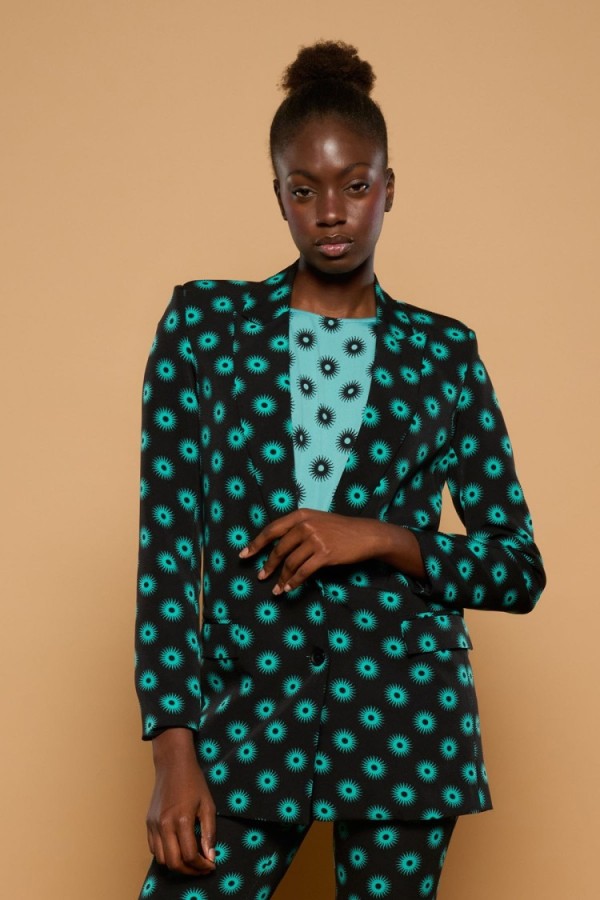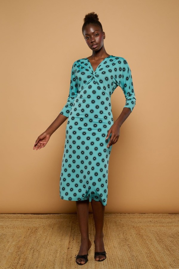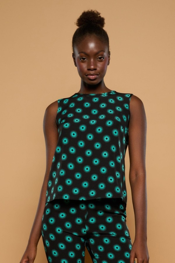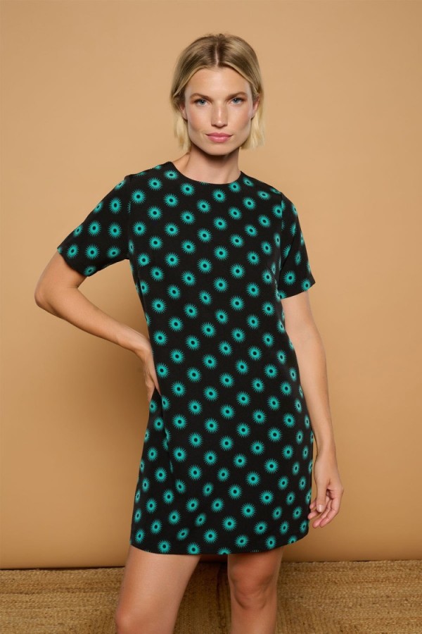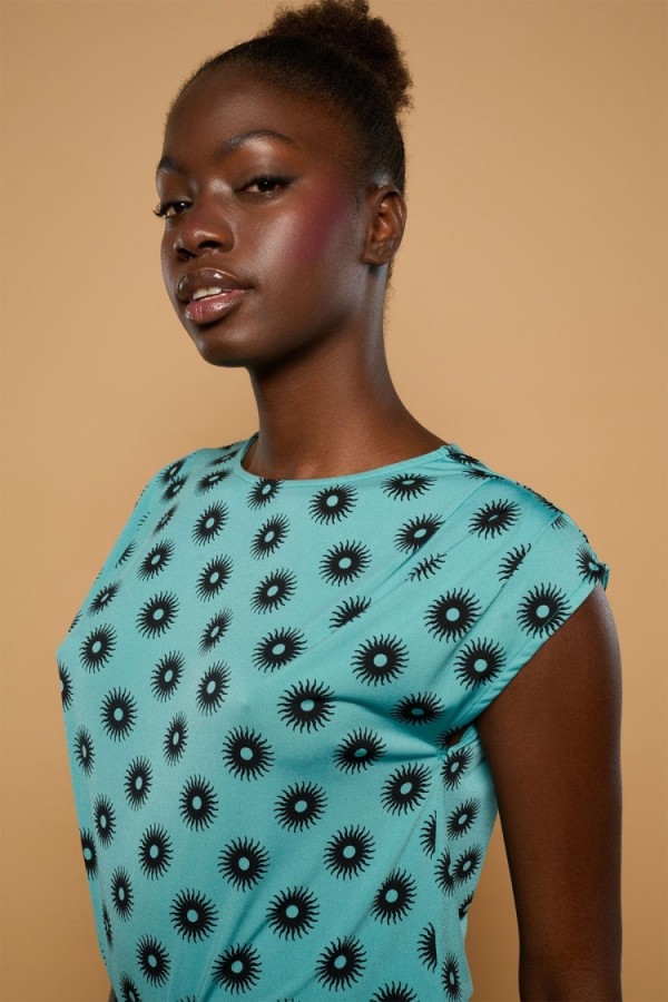 Estampado de cerezas sobre fondo rosa. Tejido satinado. La modelo mide 1,79 m y lleva la talla S.