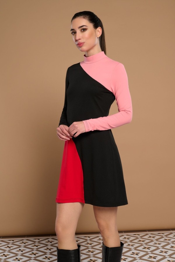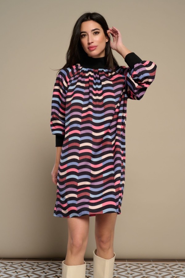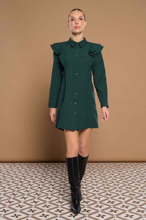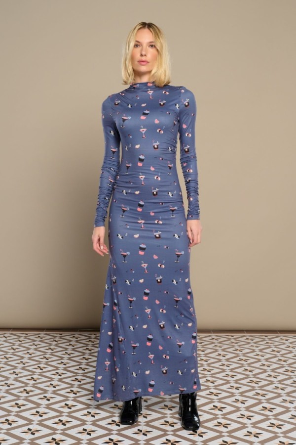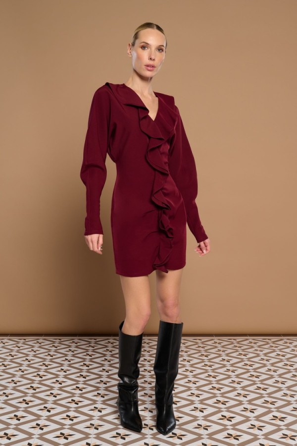 Long dress in elastic knit. Round neck and long sleeves. Detail of fans on the shoulder. Model is 178 cm and wears size S.