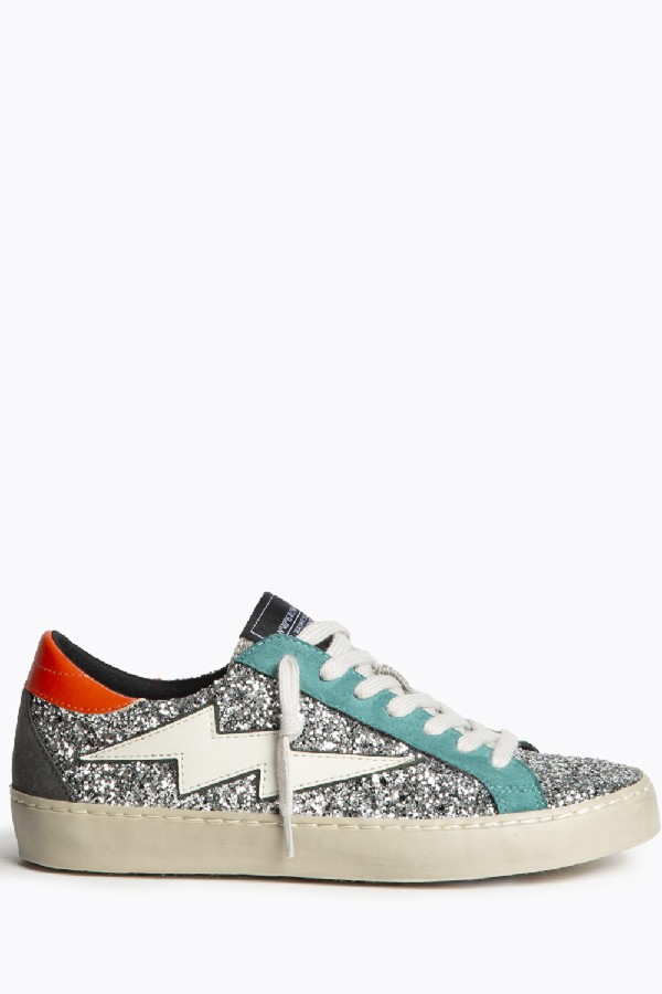 Women’s Sneakers in Glitter silver. Ray on the side. Cut in combination of materials. Faux leather in orange and green.