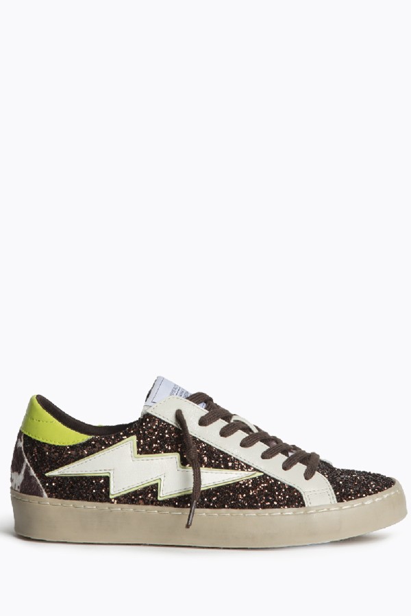 Women’s Sneakers in Brown Glitter. Ray on the side. Cut in combination of materials. Leather in white and yellow. Cow print hair effect.