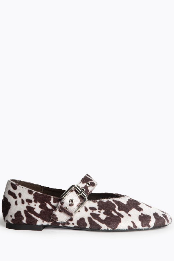 Mary Jane ballerina flat. Buckle closure on the side of the instep. Round tip finish.