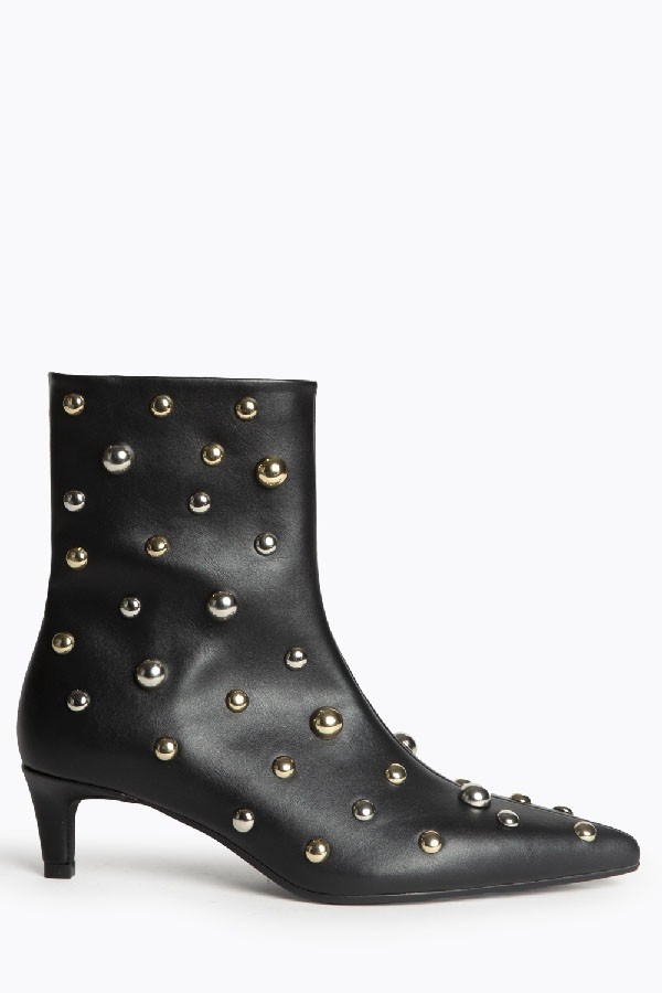 Ankle boot with medium heel. Detail of studs. Finished at the tip. Thin heel. Zipper on the inside side.