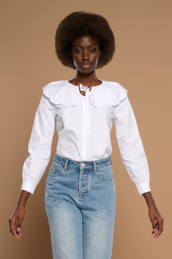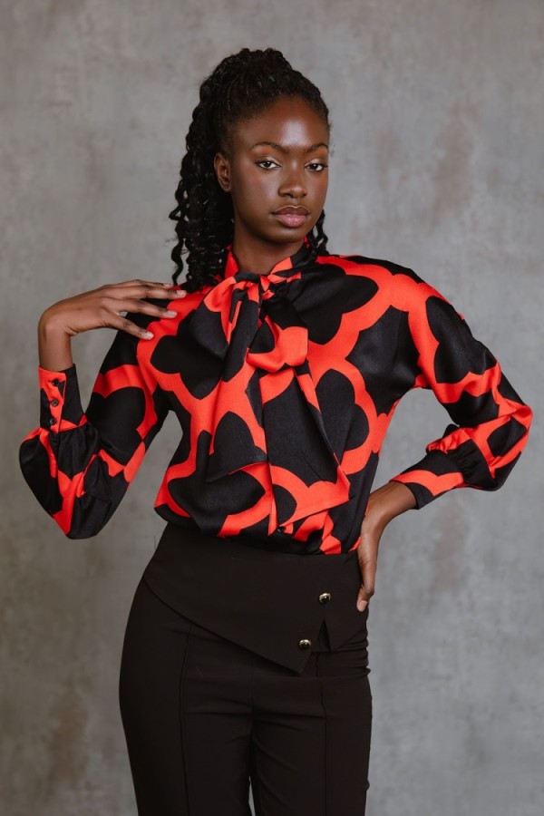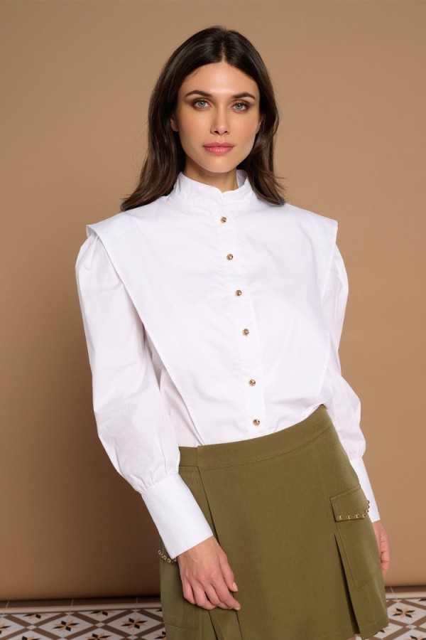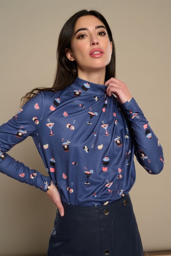 Shirt with lapel collar and long sleeves finished in cuff. Closure with front hidden buttons with lapel. Geometric print. Model is 181 cm and wears size S.
