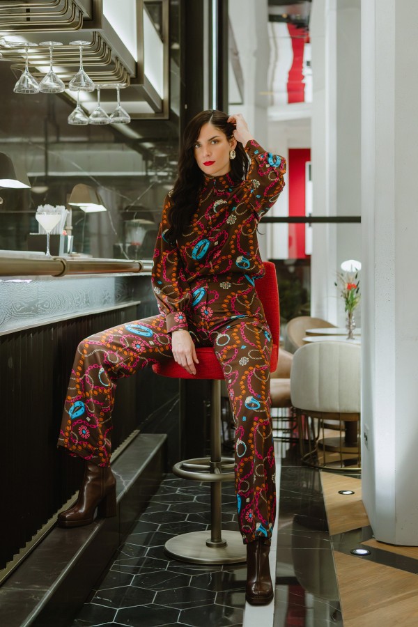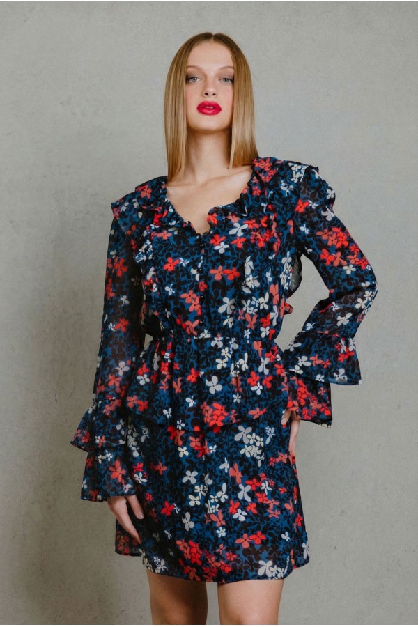 Short dress with round neck and long sleeves. Inner lining. Glamour print. Back closure with opening and button.Model is 170 cm and wears size S.