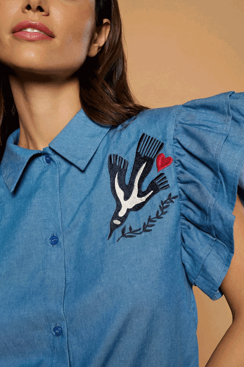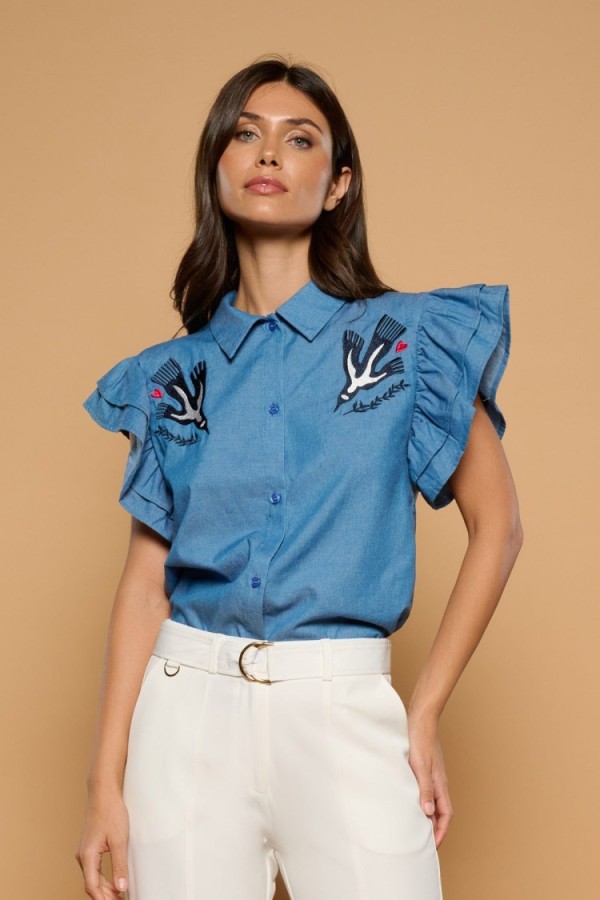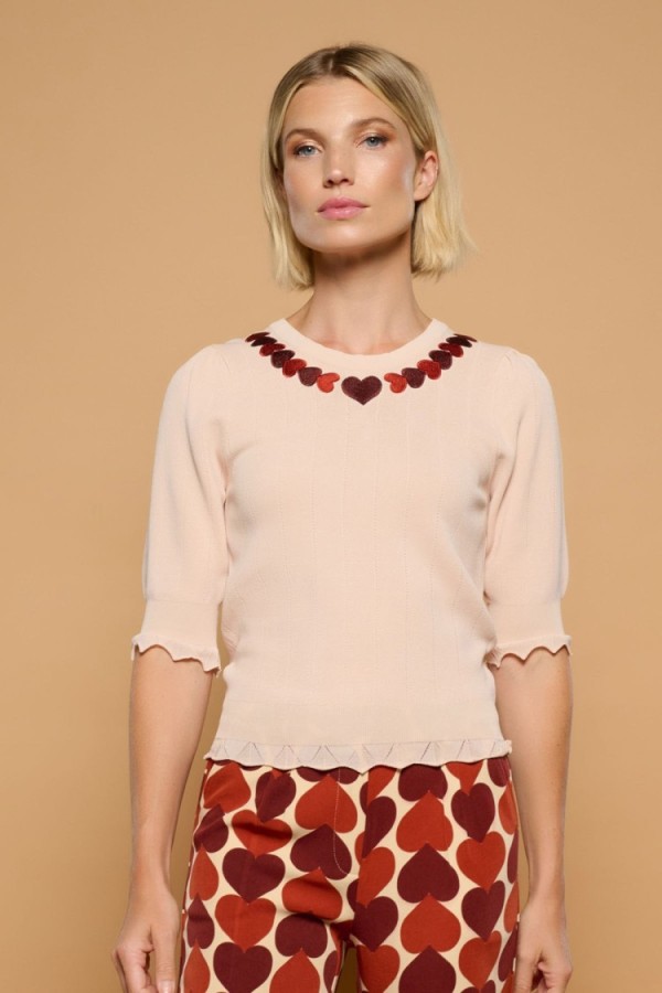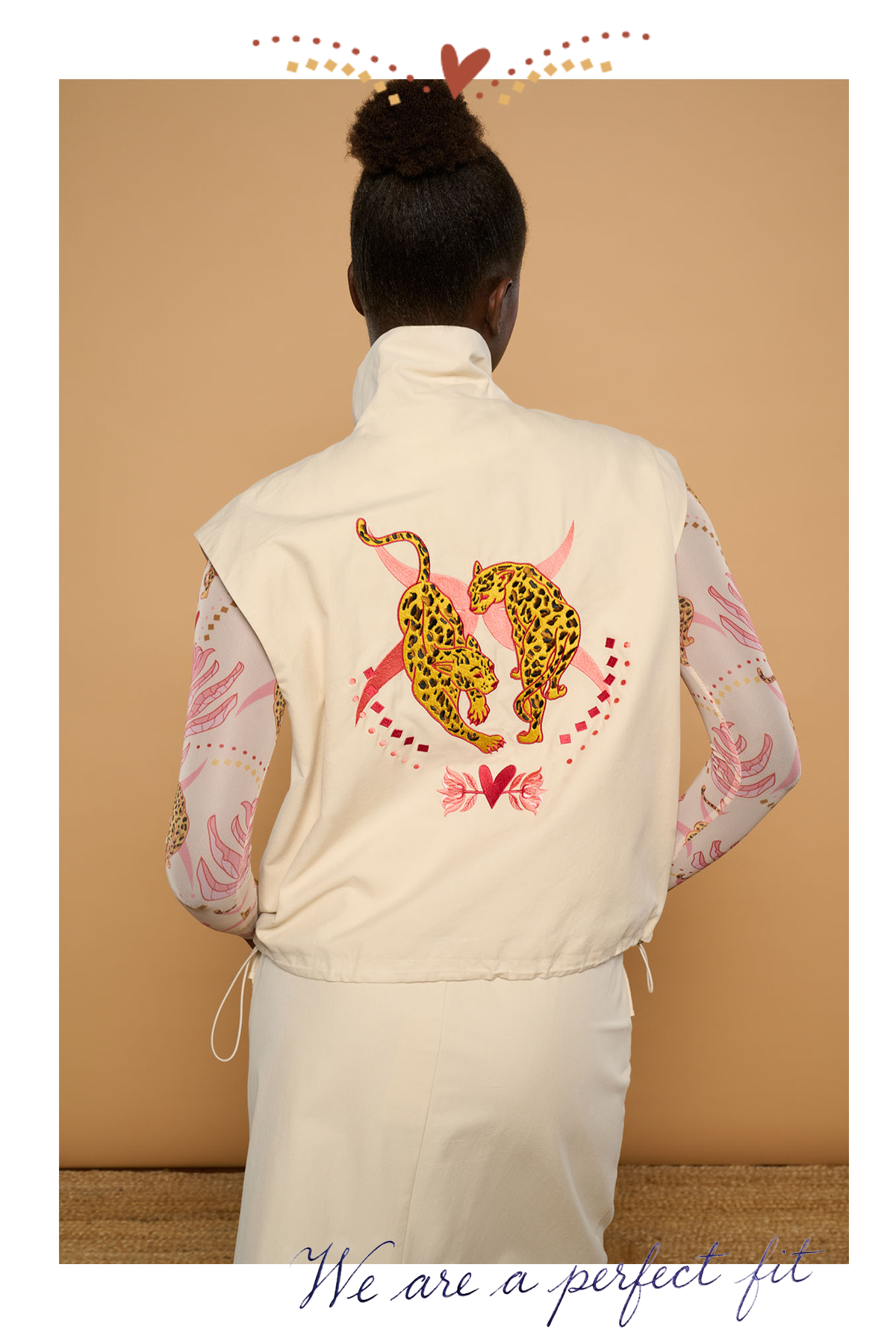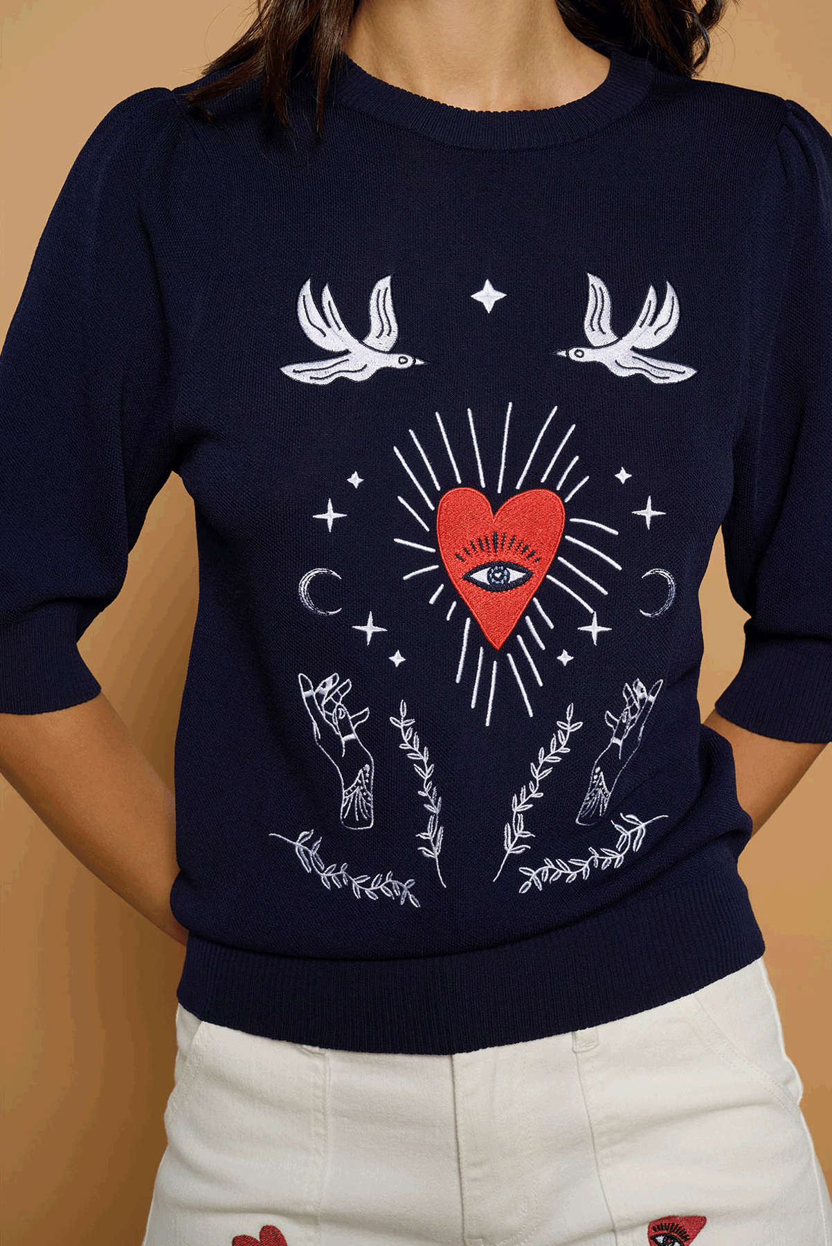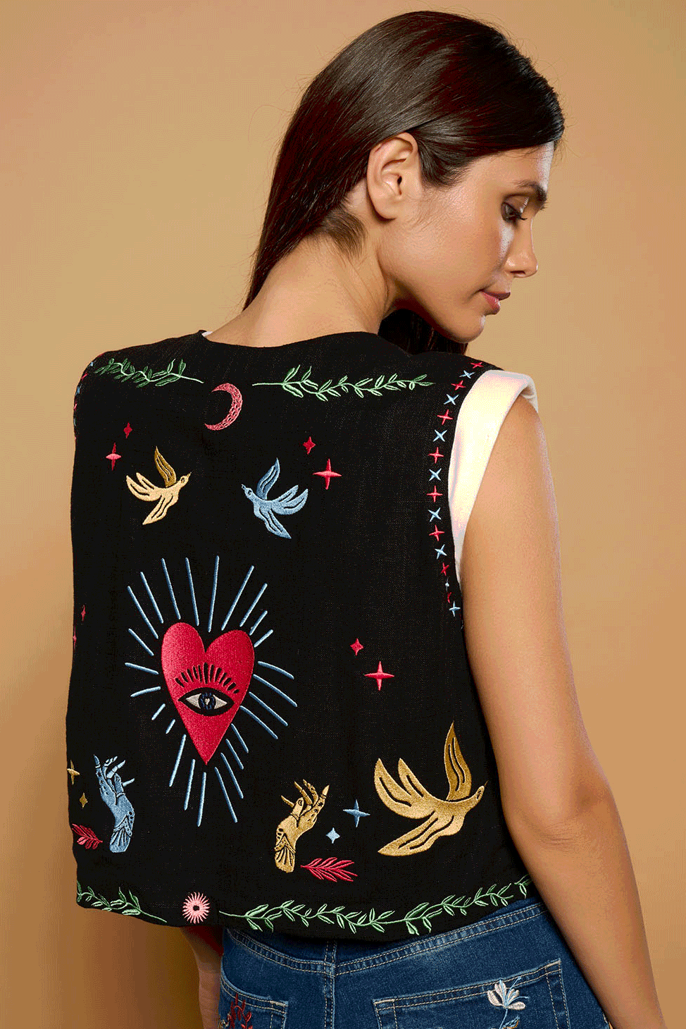 Chaqueta blazer de cuello solapa y manga larga con hombreras. Detalle de corazón místico bordado en espalda. Solapa efecto bolsillos laterales. Cierre con botones frontales.La modelo mide 1,74m y lleva la talla S.