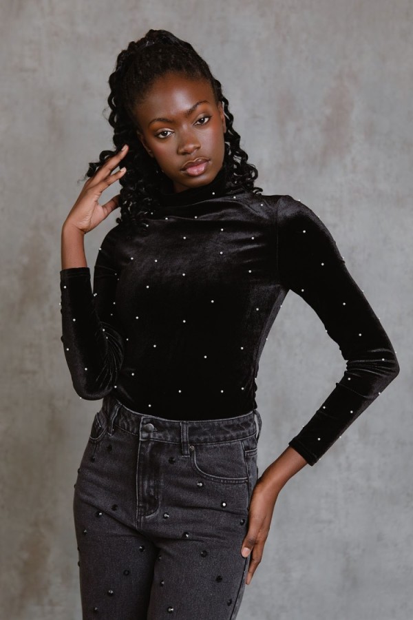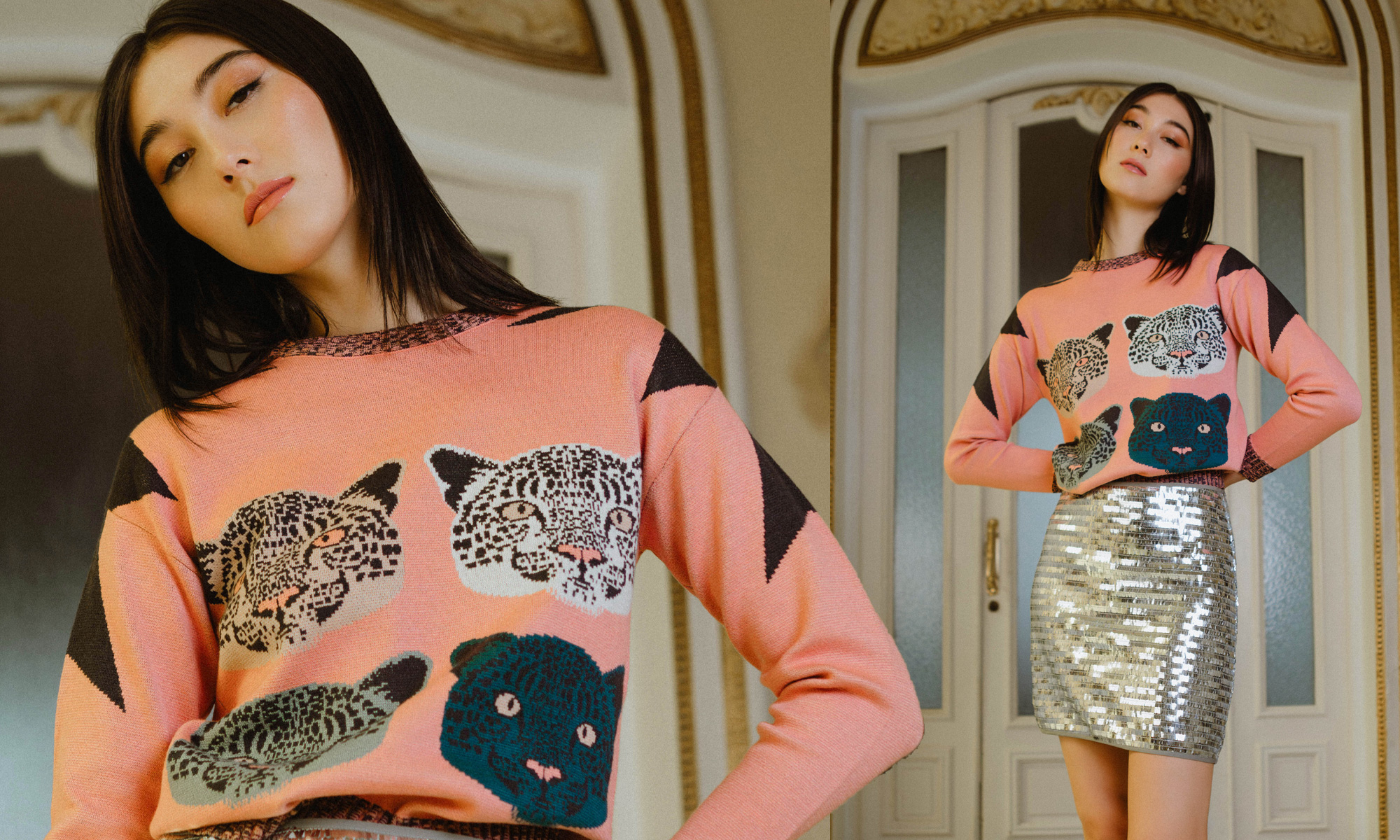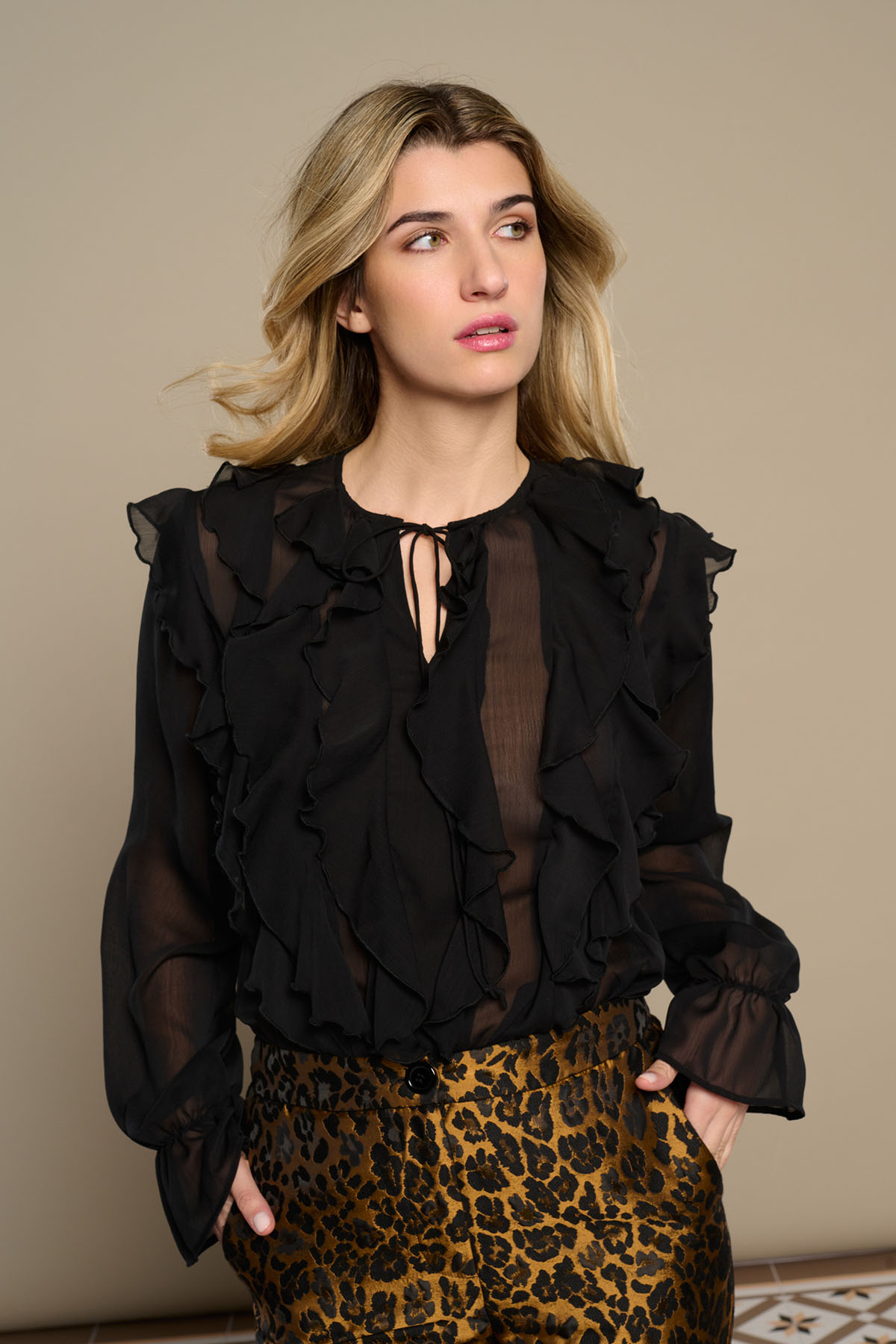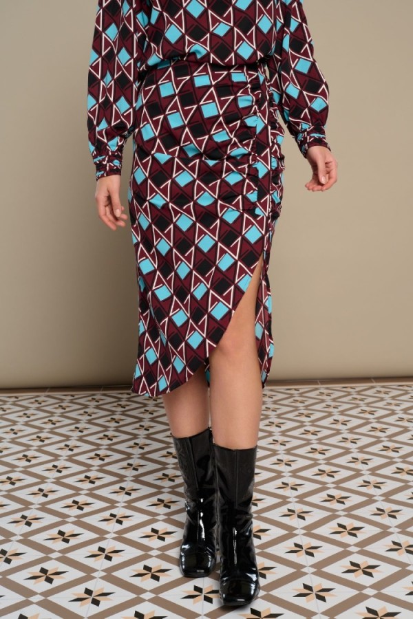 Long sleeved pleated perkins neck blouse. Geometric cat print in blue, black and burgundy. Back closure with opening and button.La modella è di 1,78 m ed indossa una taglia S.