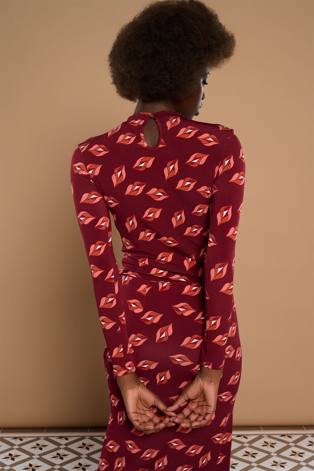 Midi dress with round neck and long sleeves. Stretch fabric. Lip print. Frills on the sides.