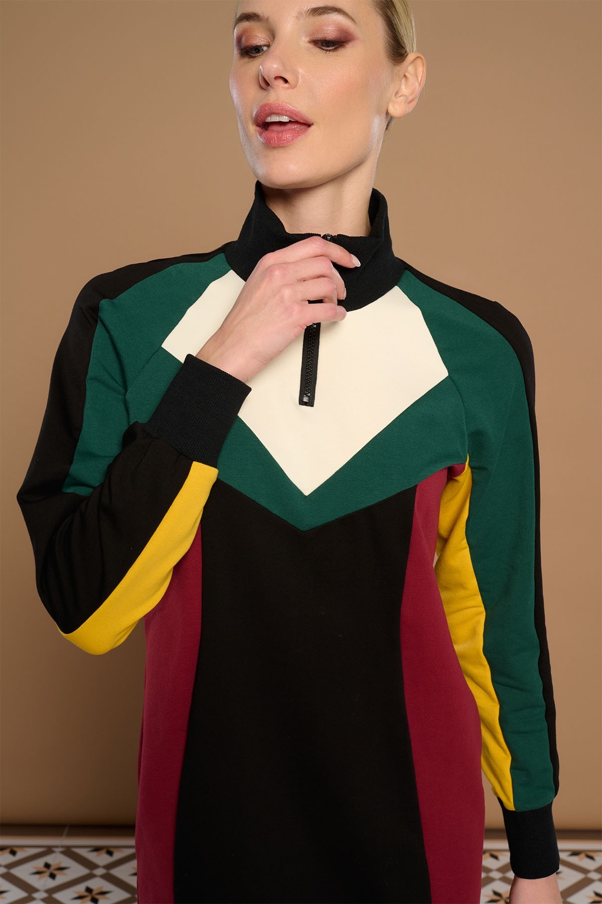 V-neck midi dress with long sleeves and cuffs in honeycomb. Floral print in blue, white and red. Inner lining.