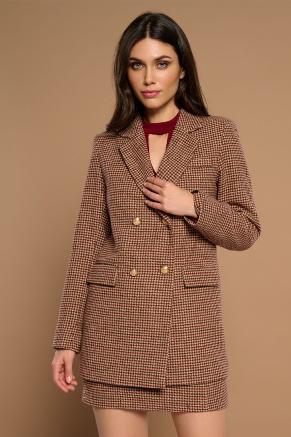 Blazer jacket in beige, camel and red tones. Collar flap and long sleeves with shoulder straps. Inner lining.