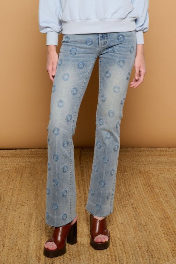 Mid-rise straight-leg jeans. Front patch pockets with button detail. Medusa embroidery on back pockets. Front zip and button fly. Frayed hem.Model is 178 cm and wears size S.