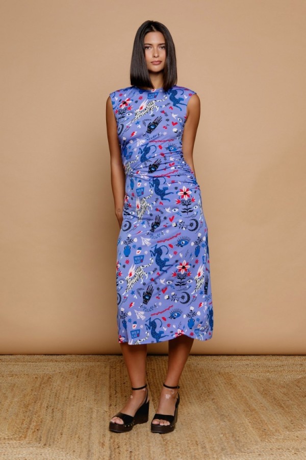 Round neck short-sleeved dress. Slim fit. Side gathering with a draped effect. Asymmetric wrap-style hem. Mystic print. Stretch fabric.