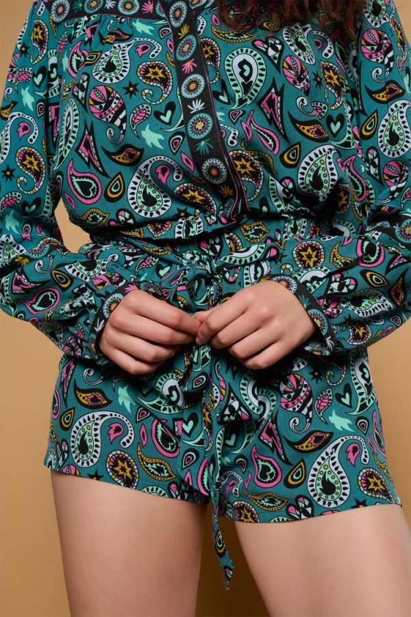 V-neck midi dress with short sleeves. Smocked elasticated waist. Paisley print in green, blue, pink, and yellow tones. Fluid silhouette. 100% viscose.Model is 181 cm and wears size S.