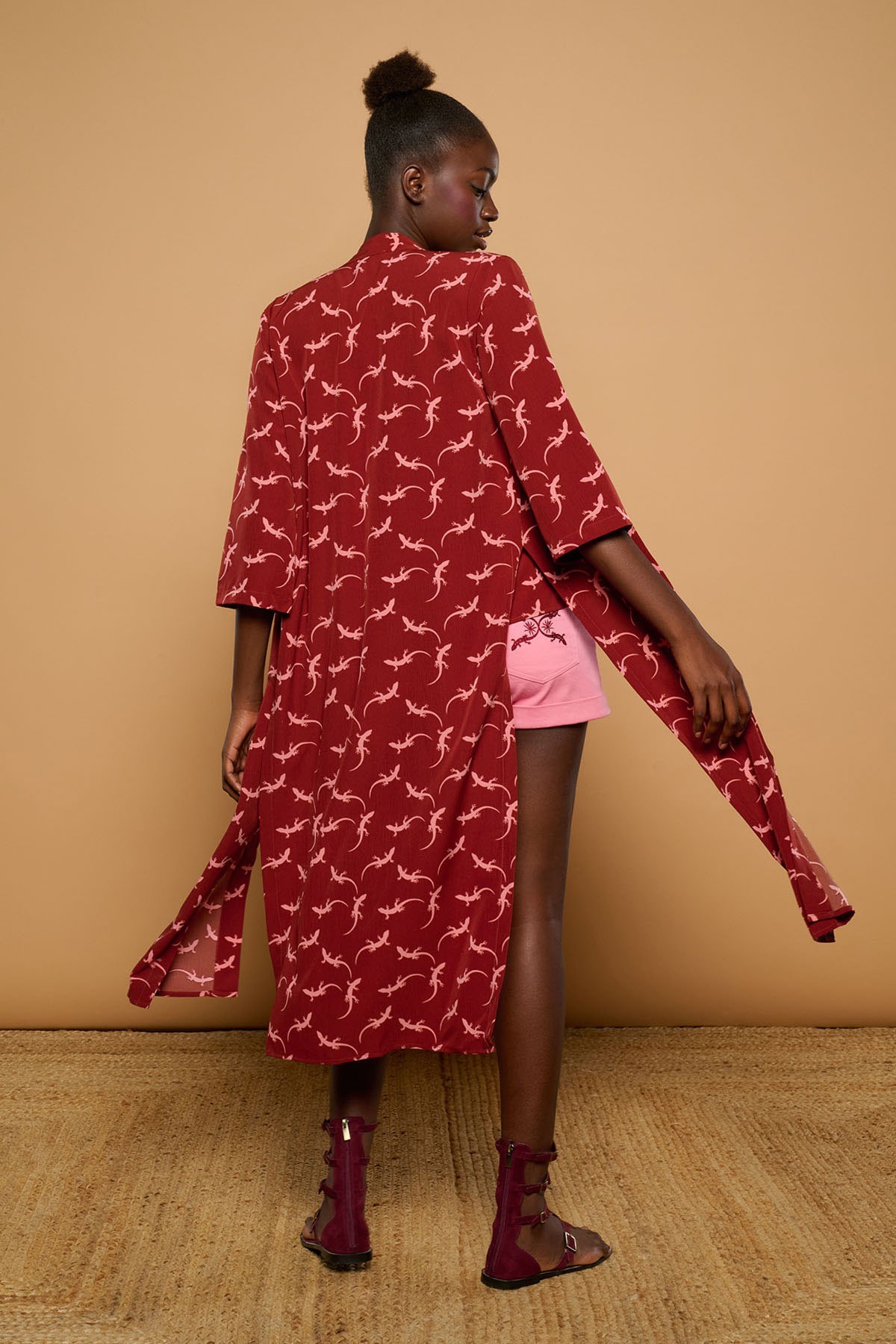 Kimono-style jacket. Midi length. Open design. Lizard print. Fluid fabric. Side slits. Loose fit.